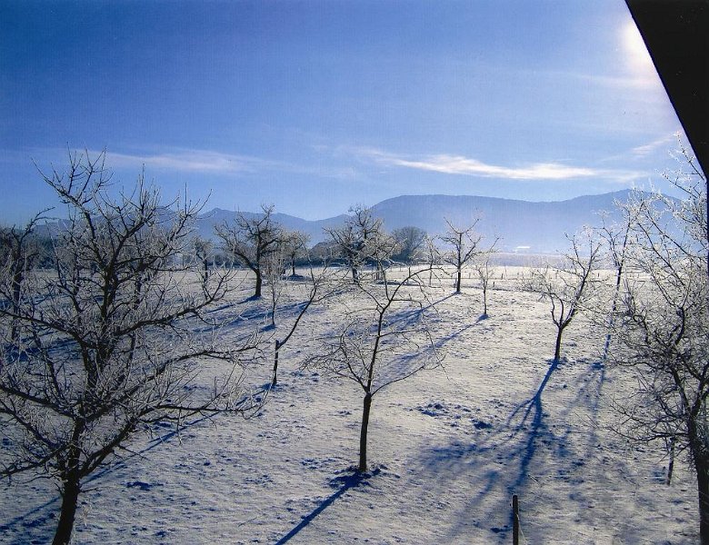 6Obstgarten im Winter Frost und Schnee bringen die Obstbäume in der Wintersonne zum Glitzern