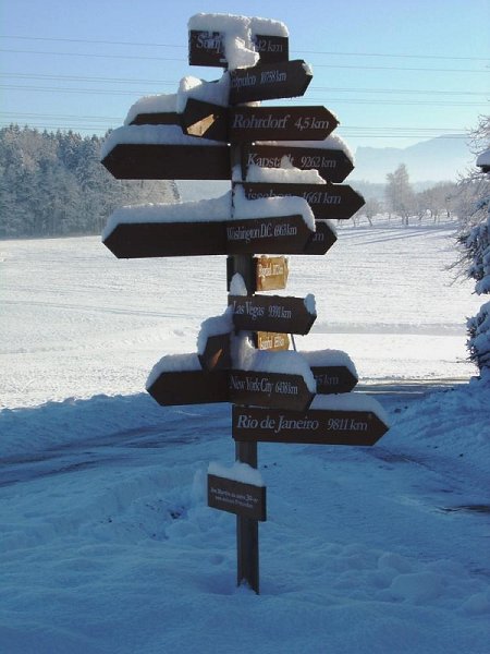 11Wegweiser Obermoosen liegt im Mittelpunkt der Weltmetropolen, wie der Wegweiser in der Ortschaft beweist.